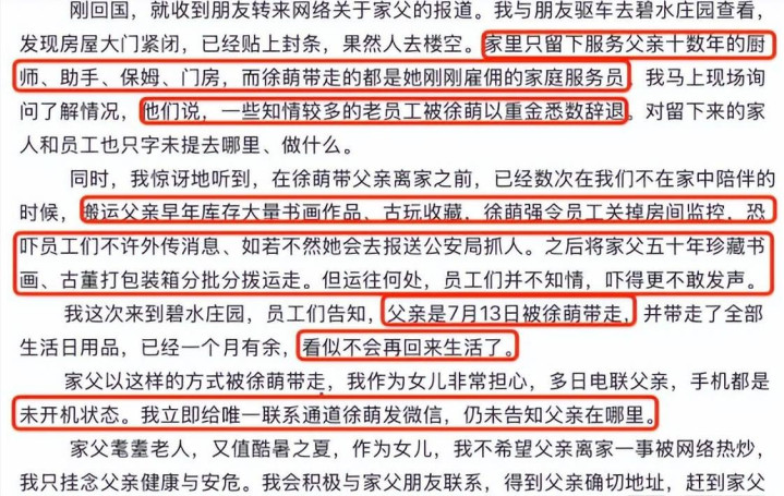 从家里员工那儿听说,老爷子在7月被第四任妻子徐萌带走了,连同生活用品和家里珍藏的价值不菲的书画古玩,也都打包搬走了。