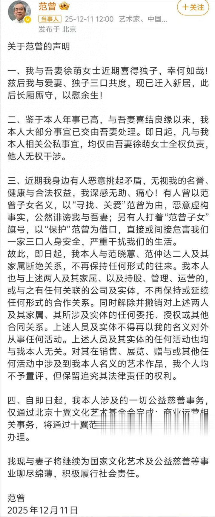 范曾今年87岁高龄,此时得子,又对家庭和事业重新并彻底划分,很难不让人联想到身后事的安排。